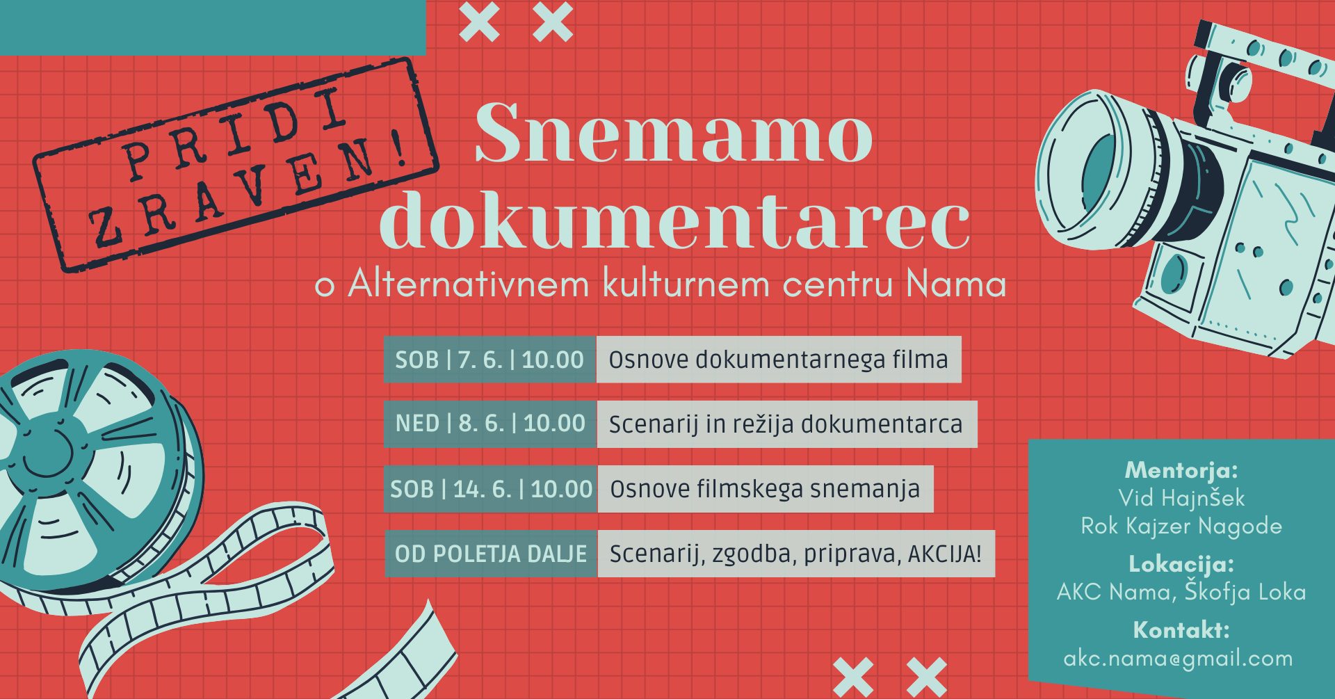 Vabljeni vsi, ki bi se radi naučili kaj novega, pa tudi vsi ostali, ki bi radi postali del filmske ekipe, ki bo snemala dokumentarec o AKC Nama, ter k njemu prispevali kot pisci, snemalci, montažerji. Dobrodošli vsi kreativci z dobrimi idejami, za vsakega se bo našlo mesto.