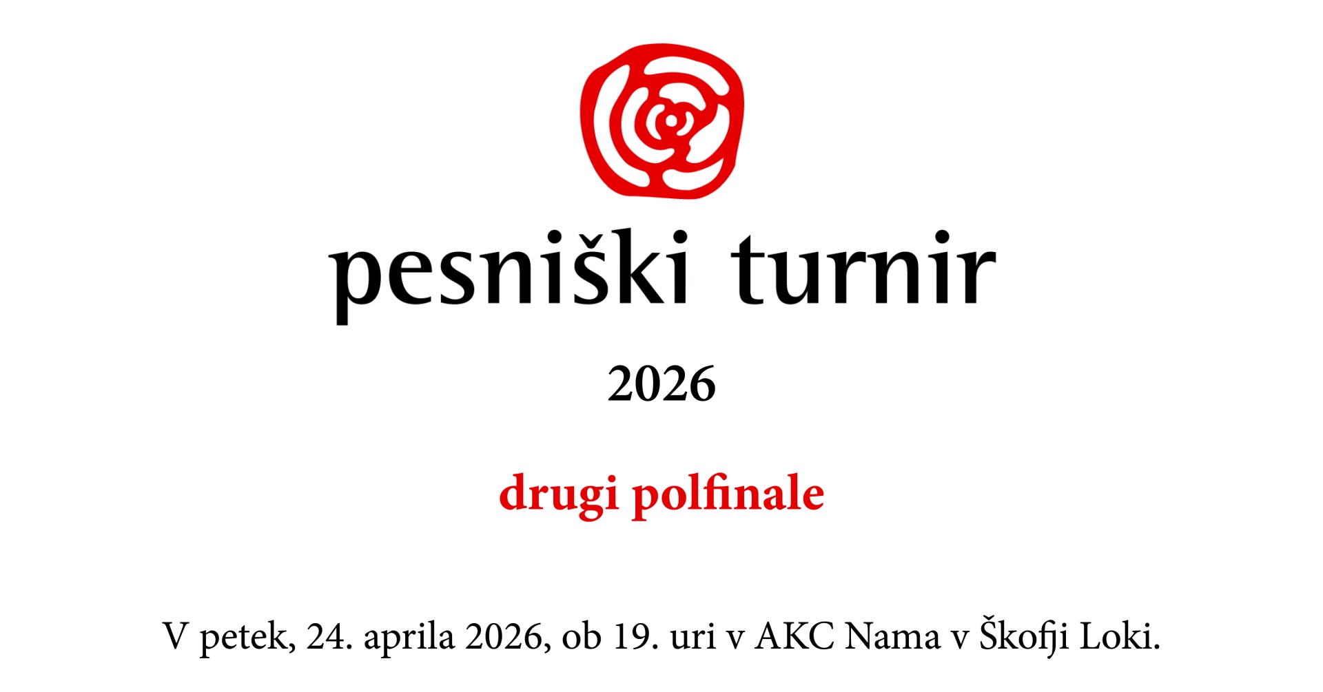 Pesniški turnir je natečajna prireditev, na kateri se letos že 26. leto izbira najboljša neobjavljena slovenska pesem v tekočem letu. Strokovna žirija (v sestavi dr. Irena Novak Popov, dr. David Bedrač in Franci Novak) bo 31. marca razglasila 24 polfinalistov. Na drugem polfinalu v Škofji Loki se bo 12 pesnikov in pesnic pomerilo za šest mest v finalu. Štiri bo izbrala žirija, dva pa občinstvo z glasovanjem., Vsak obiskovalec prejme zbornik polfinalnih pesmi.